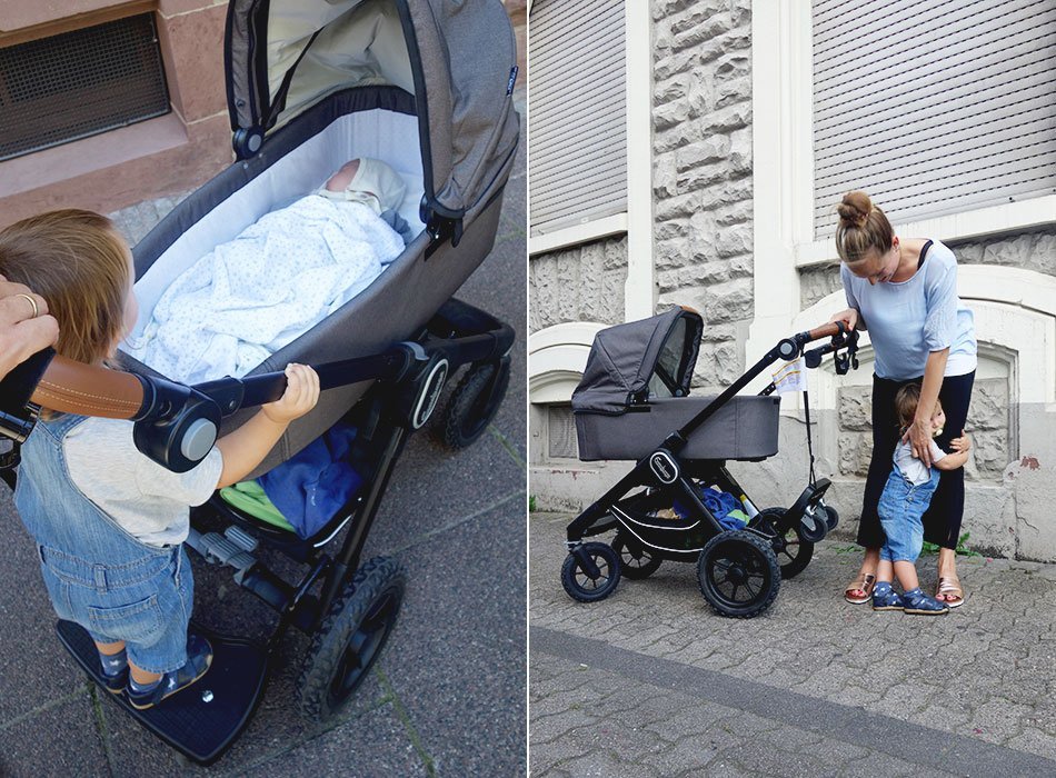 Am fünften Tag nach der Geburt haben wir dann einen ersten kleinen Ausflug als vierköpfige Familie nach draußen gemacht. Augustbub lag das erste Mal im Kinderwagen und J.Boy durfte das neue Mitfahrbrett aka „große Bruder Brett“ einweihen. Wir haben eine kleine Runde um den Block gemacht, ein süßes Teilchen beim Bäcker gekauft und dieses anschließend bei einem Mini-Picknick gefuttert. Ganz simpel und dennoch ein wundervoller Moment.